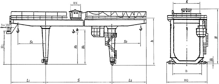 本起重機由橋梁、大車運行機構、小車、電氣設備組成。橋架采用箱形焊接結構,大車運行機構采用分別驅動。全部機構均在操縱室內操縱。起重機導電形式分為電纜和滑觸線兩種,訂貨時任選一種。選用本起重機時須填寫訂貨規范表,須注明使用時工作環境的最低溫度和最高溫度以及電源等。