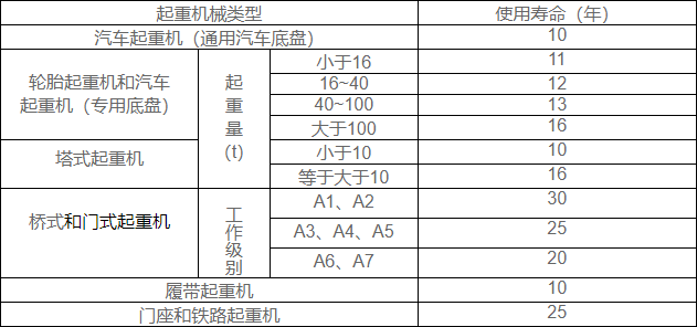 零件和結構的使用壽命由多種因素確定,如安全性、失效的后果、裂紋發現的難易、工作級別和經濟性等。國外文獻推薦的起重機械零件和金屬結構的使用壽命見下表: