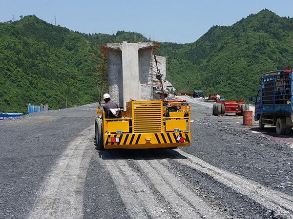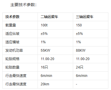 性能介紹:主要適用于預制梁場與架橋工地較遠,不適合鋪軌或鋪軌費用較高的場合。運梁車的剎車系統對縱坡有較大的適應性。輪胎與地面摩擦阻力比軌道式運梁車有顯著的優勢。