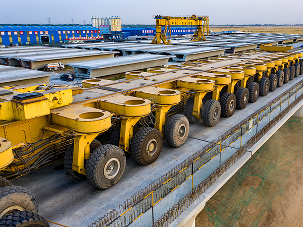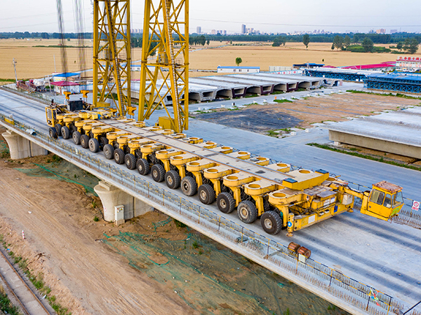 1.450t-900t 運梁車主要用來運輸大噸位混凝土預制箱形梁,可降單線或雙線整孔箱梁從預制場轉運至架梁工位,與架橋機配合完成相應的架梁作業。同時,運梁車還可馱運架橋機實現橋間短途運輸,滿足架橋機轉場作業的要求。